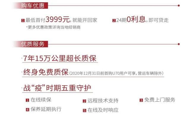 目前,潍柴U70共推出6款车型,售价区间为6.99-11.09万元。当然,购车优惠政策少不了,最低首付3999元就能开回家!此外,诸如终身免费质保、7年或15万公里超长质保以及战“疫”时期五重守护(在线续保、远程技术支持、免费上门服务、保养延期执行、在线及时响应)等优质服务也可以尽情享受。