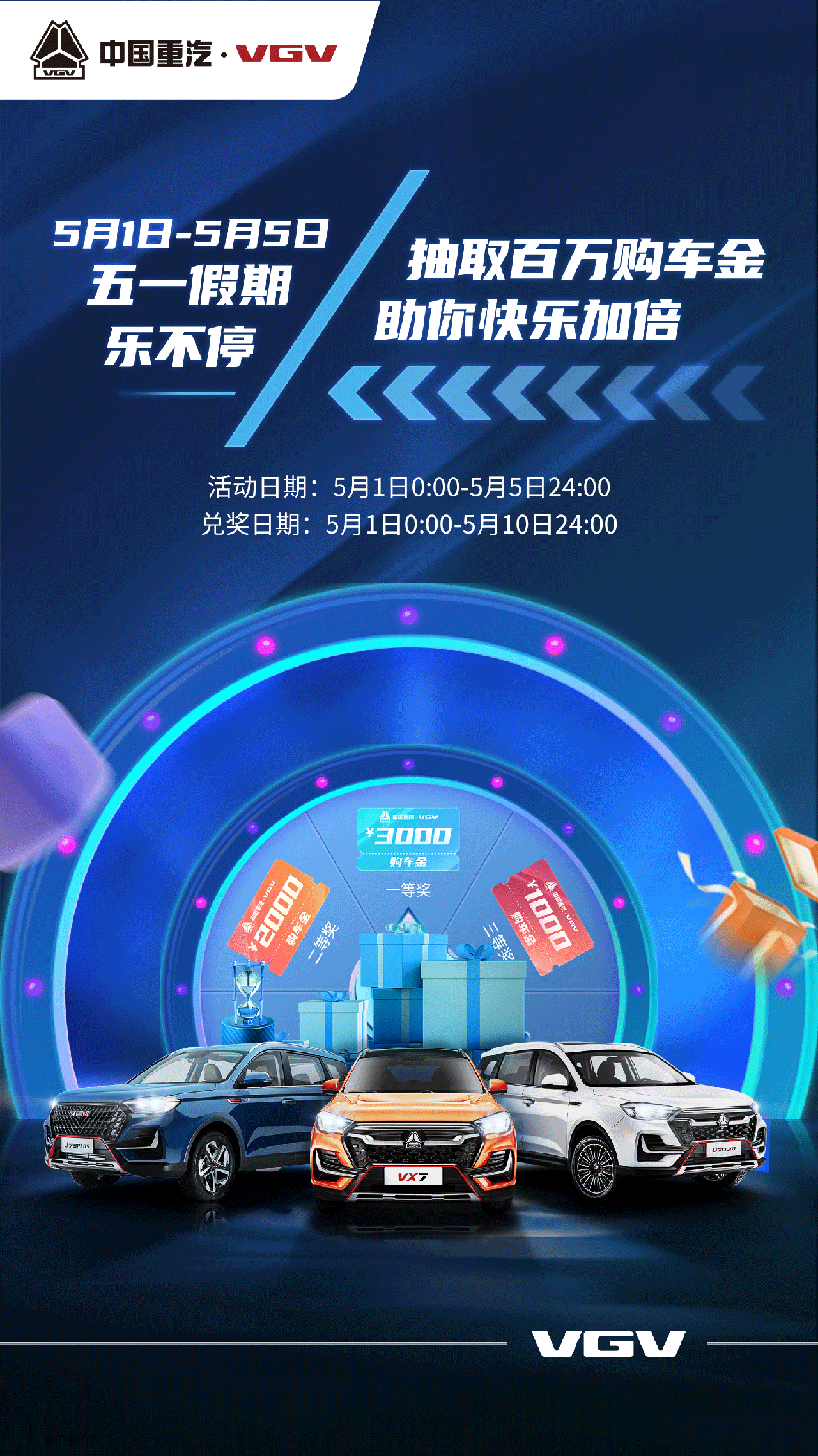 中国重汽VGV为了增强用户参与感与体验感,钜惠购车金活动通过「大转盘抽奖」方式回馈广大用户。动动手指就有机会获得最高3000元的购车金,活动时间为5月1日0:00-5月5日24:00。