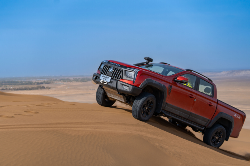 秋天的库木塔格沙漠,少了几分燥热,多了一丝宁静,但高低起伏的沙丘、沙山不会让穿越的难度因此而降低。在沙漠中行车,松软的沙窝、流动的沙丘让车辆时刻有陷车甚至翻车的风险,“快走沙“是顺利穿越沙漠的诀窍,如何在沙漠中快速行驶,强劲的动力输出和反应灵敏的四驱系统是关键。搏胜皮卡搭载的潍柴动力WP2H 2.0T柴油发动机,最大扭矩达420N·m,1000rpm时转速可达210N·m,不仅能输出充足动力,也能让车辆起步更快,提速更早,同时,在沙漠中,打滑几乎时刻伴随,搏胜皮卡采用的博格华纳适时四驱系统反应迅速,能敏锐察觉车况及时调整动力输出,让车辆免于陷车的危险。而在冲坡、滚刀锋、刷锅等高难度穿越项目中,搏胜皮卡搭载的沙地模式不仅能调整动力输出与驱动方式,而且能带来更稳定的操控性能,连绵起伏的大角度沙坡也能顺利翻越,尽情感受沙漠冲浪的刺激与快感。